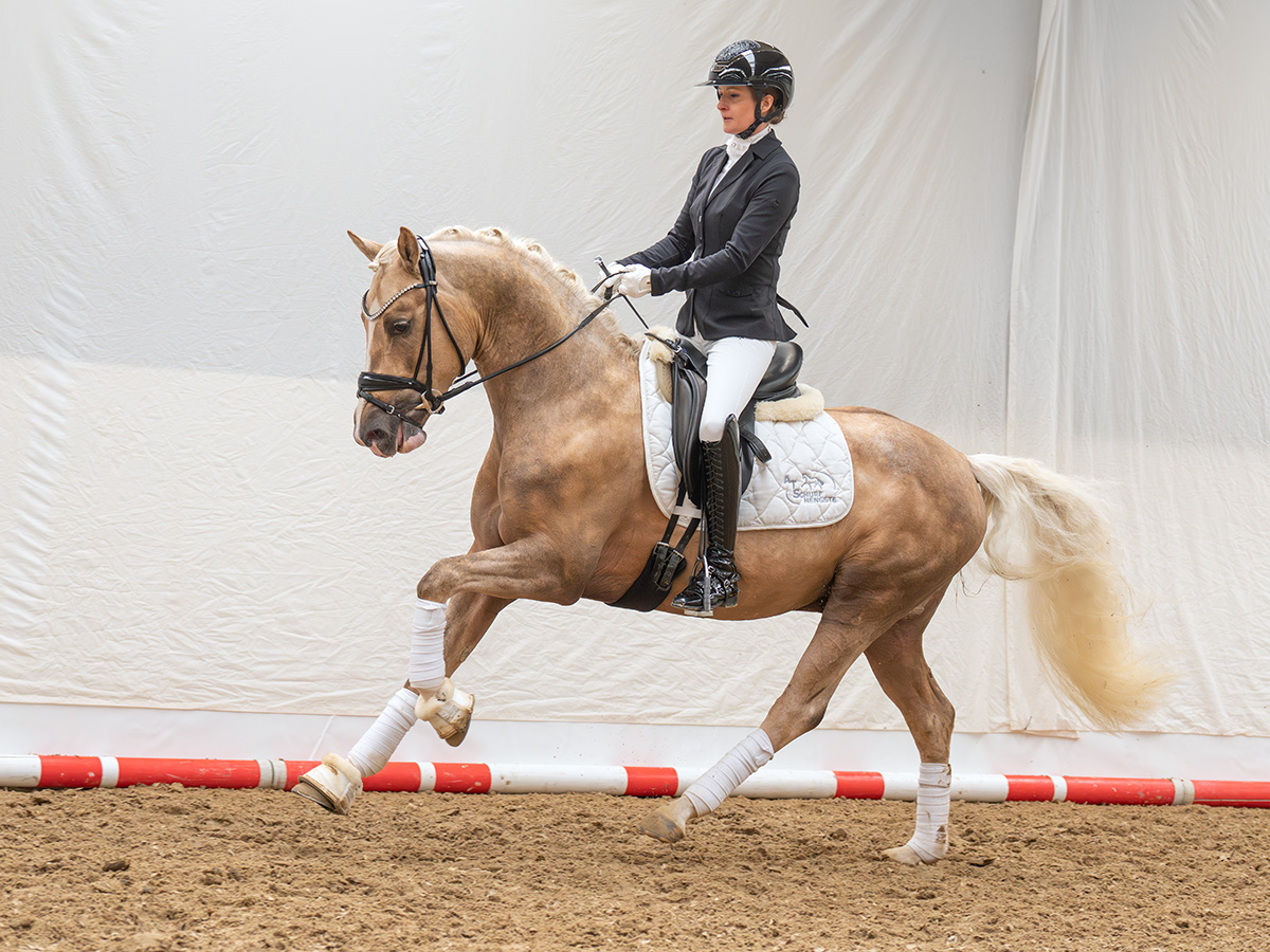 Dance to the Beat konnte die Körkommission anlässlich der Rheinischen Körung mit seinem außergewöhnlichen Charme und seiner Ausstrahlung überzeugen. Der wunderschöne Palomino zeigt sich stets in allen drei Grundgangarten in herausragender Form. Besonders im Trab begeistert er mit viel Schwung und Hebel, während er im Schritt durch einen sehr guten Übertritt und unerschütterliche Taktsicherheit besticht. Sein Galopp, stets bergauf und kraftvoll gesprungen, unterstreicht eindrucksvoll seine hohe Qualität.